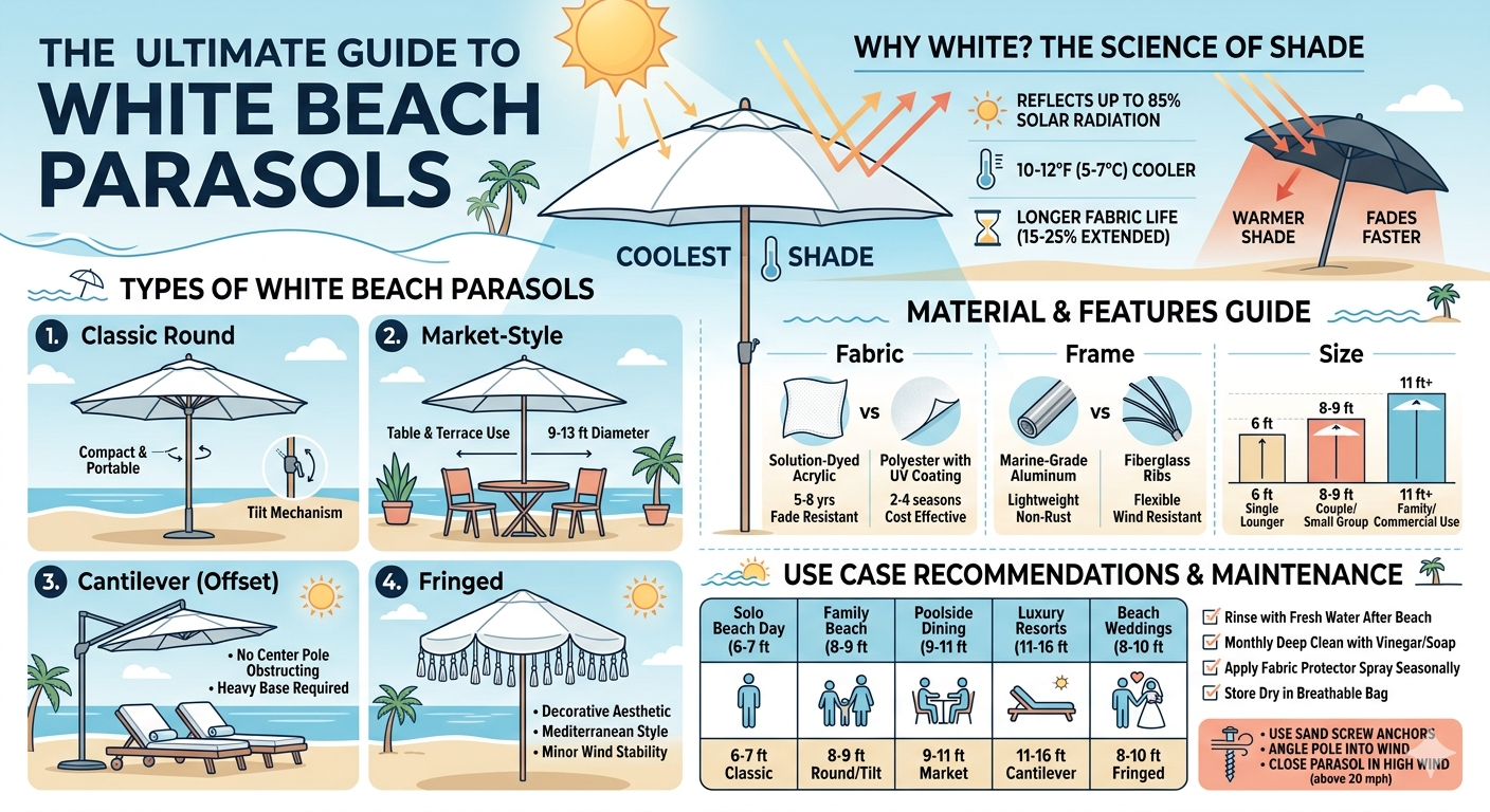 Valkoinen ei ole pelkkä tyylivalinta – se on lämpötehokkain väri rantavarjolle, koska vaaleat pinnat heijastavat aurinkoenergiaa sen sijaan, että ne imevät.