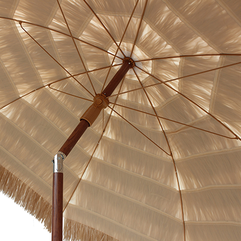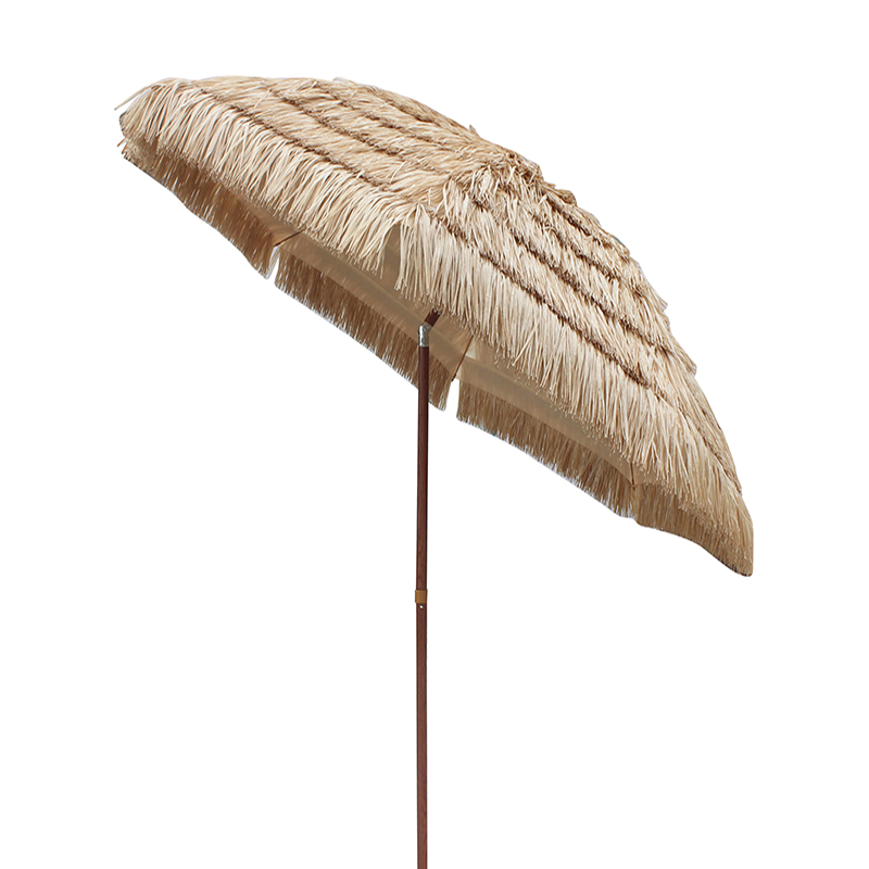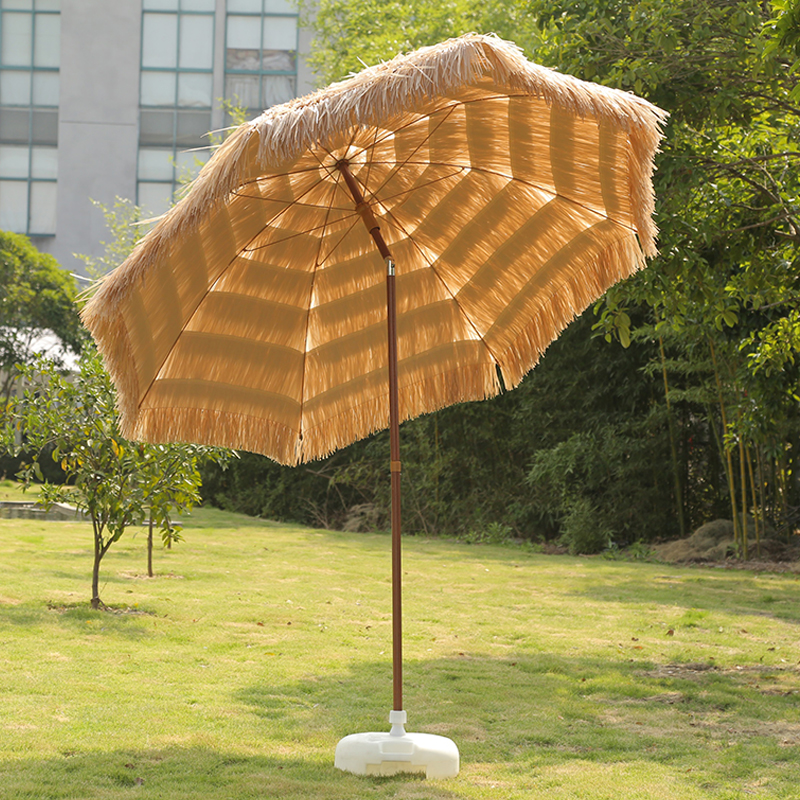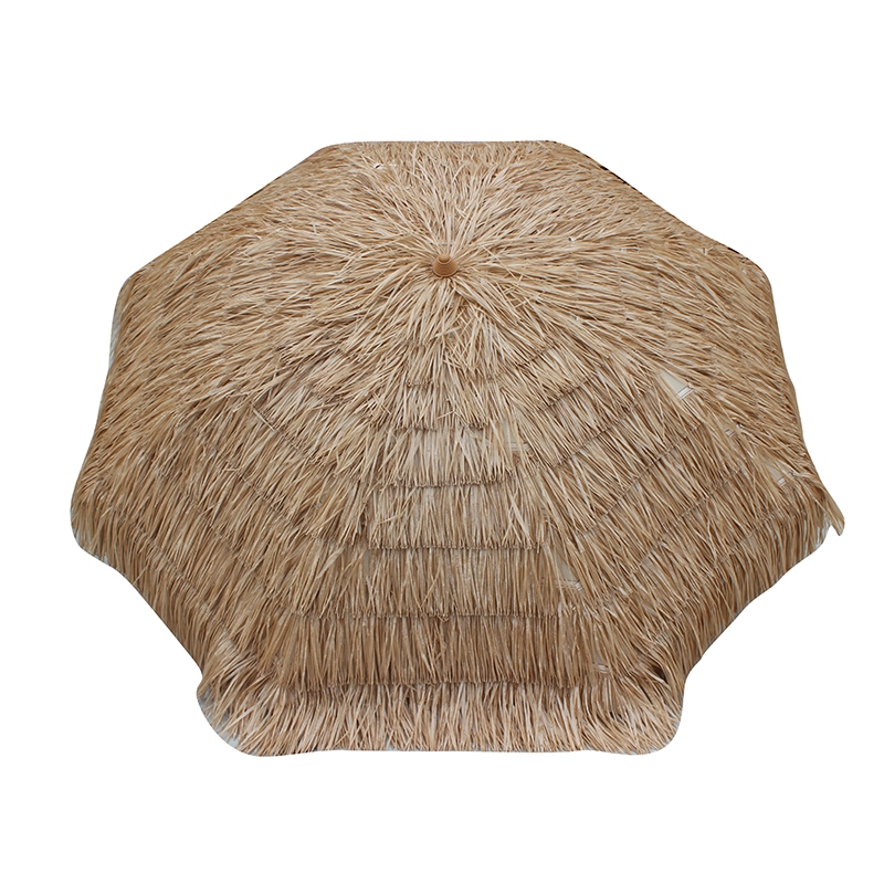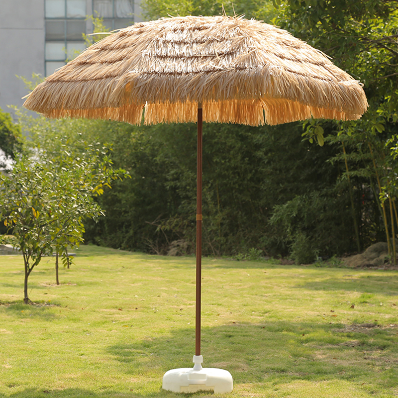 Olkikattoinen ulkonäkö: Tämä parasoli käyttää kankaana PP -ruohoa, simuloimalla luonnollisen olkikatchin tekstuuria ja ulkonäköä luomalla luonnollisen ja maalaismaisen ilmakehän. Olipa uima -altaan sijoitettu, puutarhaan tai terassille, se voi sekoittaa ympäröivään ympäristöön ja tuoda trooppisen lomakohteen.