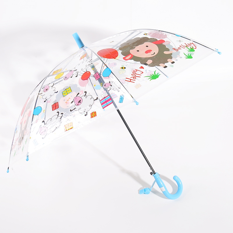 Tämän sateenvarjon ulkonäkö on hyvin ainutlaatuinen. Sateenvarjopinta on valmistettu läpinäkyvästä PVC -materiaalista, ja hieno kuvio sateenvarjopinnalla voidaan nähdä. Sateenvarjopinta on painettu söpöillä eläinkuvilla, kuten lampaat, ilmapallot, lahjapakkaukset jne., Kirkkaisilla väreillä ja elämillä kuvioilla, jotka voivat herättää lasten huomion. Sanat "Hyvää syntymäpäivää" on myös tulostettu sateenvarjolle lisäämällä erityinen yllätys lasten syntymäpäivään.