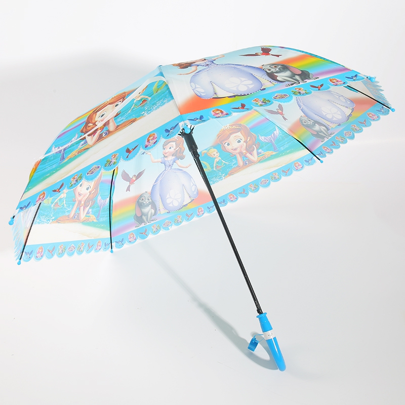 Tämän sateenvarjon ulkonäkösuunnittelu on täynnä lapsellisia hauskoja ja fantasiavärejä. Sateenvarjo on painettu söpöillä sarjakuvakuvioilla, mukaan lukien kauniit prinsessot, söpöt eläimet ja upea sateenkaarit, jotka voivat herättää lasten huomion ja pitää heidät onnellisessa mielialassa sateisina päivinä. Sateenvarjon reuna on koristeltu myös hienolla pitsillä, mikä lisää yleistä kauneutta.